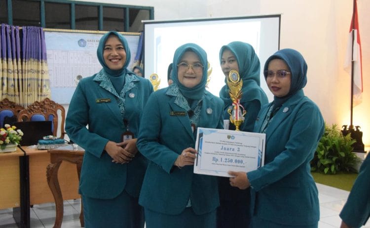 Ketua TP PKK Tabalong, Hj Desi Suryanti Noor Rifani menyerahkan piagam penghargaan bagi para pemenang lomba dalam peringatan HKG PKK ke-53 (foto: sah/sekata.id)