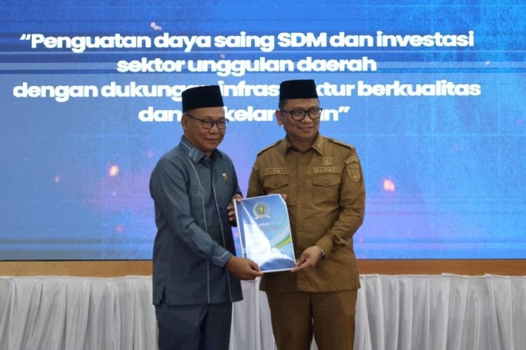 Wakil Ketua I DPRD Tabalong, H Mustafa menyerahkan dokumen pokok-pokok pikiran dewan kepada Bupati Tabalong, H Muhammad Noor Rifani (foto: dprd tabalong)